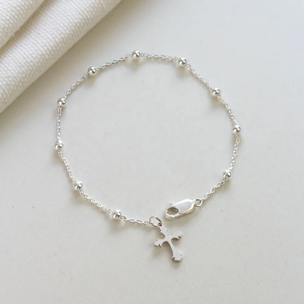 Manufacture Bead Ball Link Sterling Silver Bracelet with Cross Charm Custom Ladies 925 Sterling Silver Bracelet Jewelry